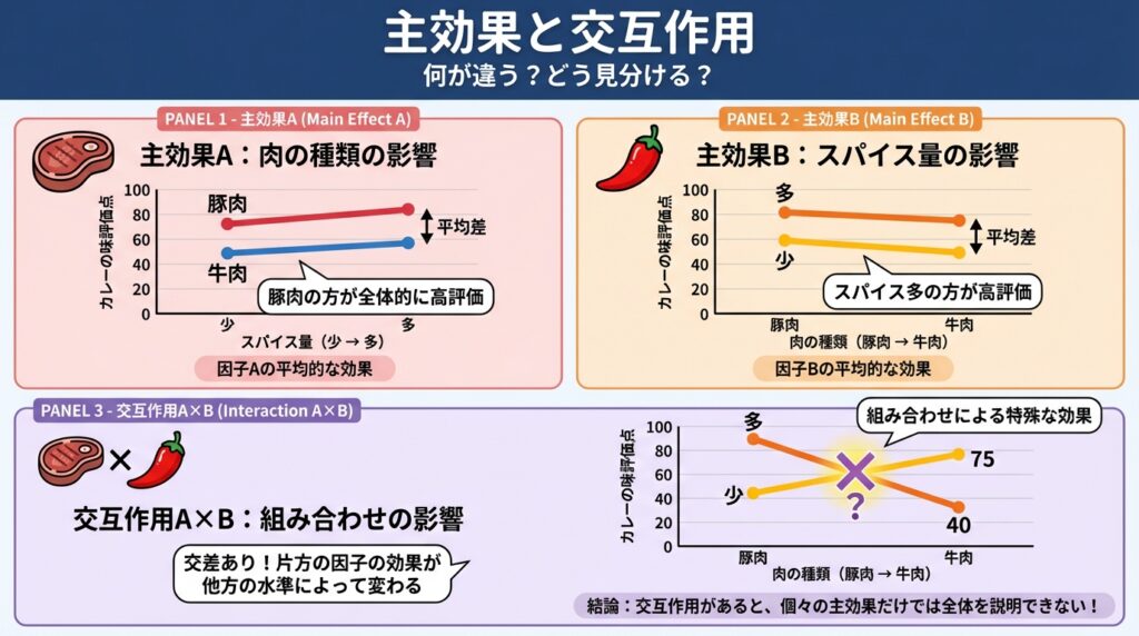- 主効果は各因子の単独の影響、交互作用は組み合わせの特別な効果