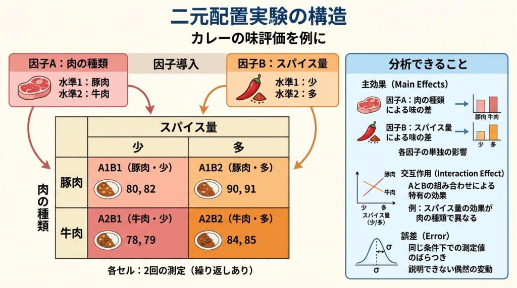 2つの因子(例えば肉の種類とスパイス量)を同時に変えたとき、結果にどう影響するかを調べる実験。