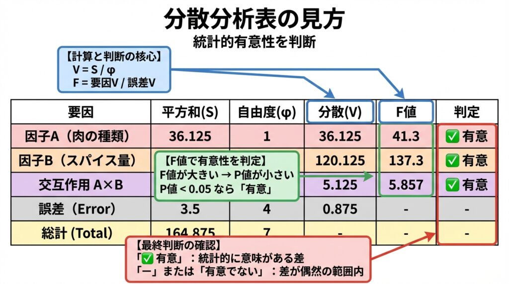 最後に、F値を計算して、各効果が統計的に有意かどうかを判定します: