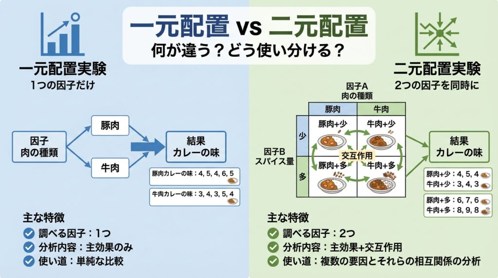 まずは、一元配置実験と二元配置実験の違いを整理しましょう。