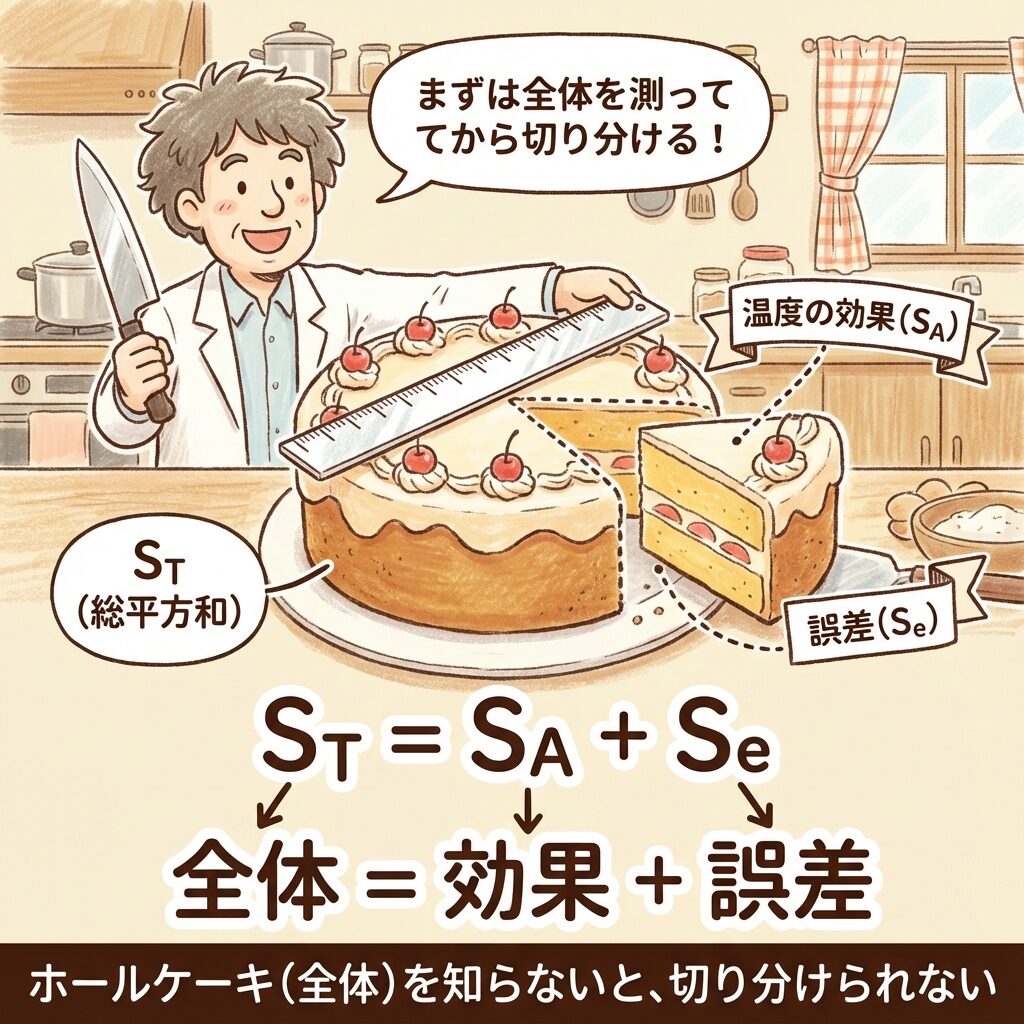 - 総平方和(ST)の意味=「ホールケーキ丸ごと」のイメージ