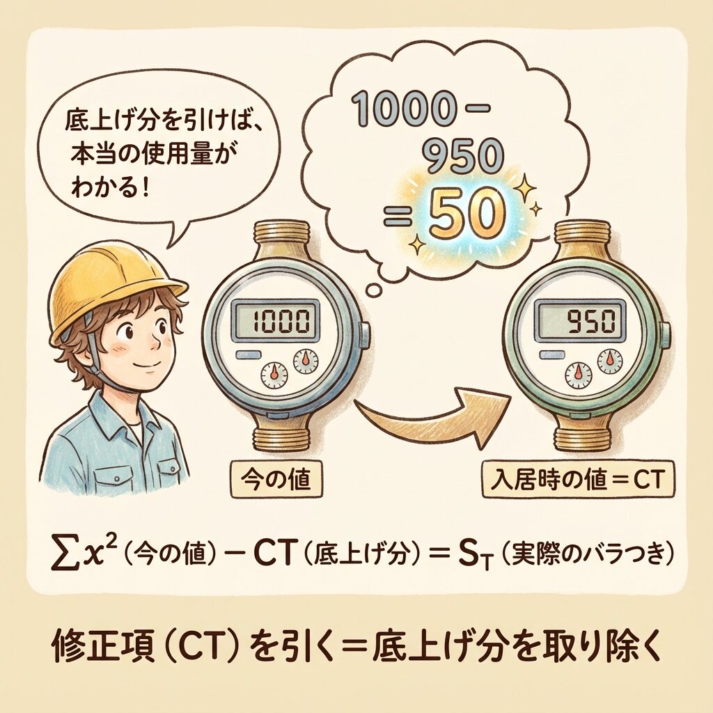 CTを引くことで、平均値の「底上げ分」を取り除き、純粋なバラつきだけを取り出せるのです。