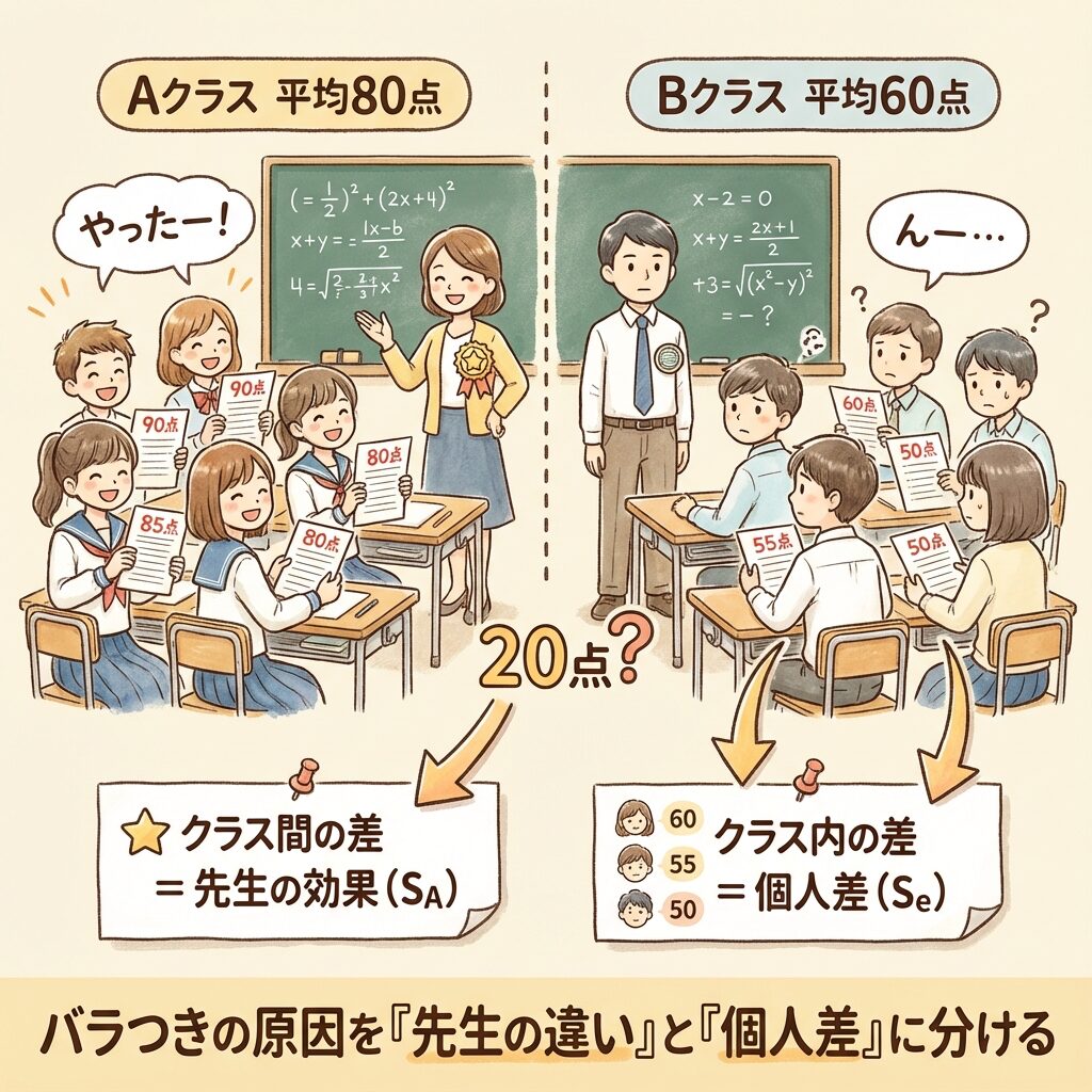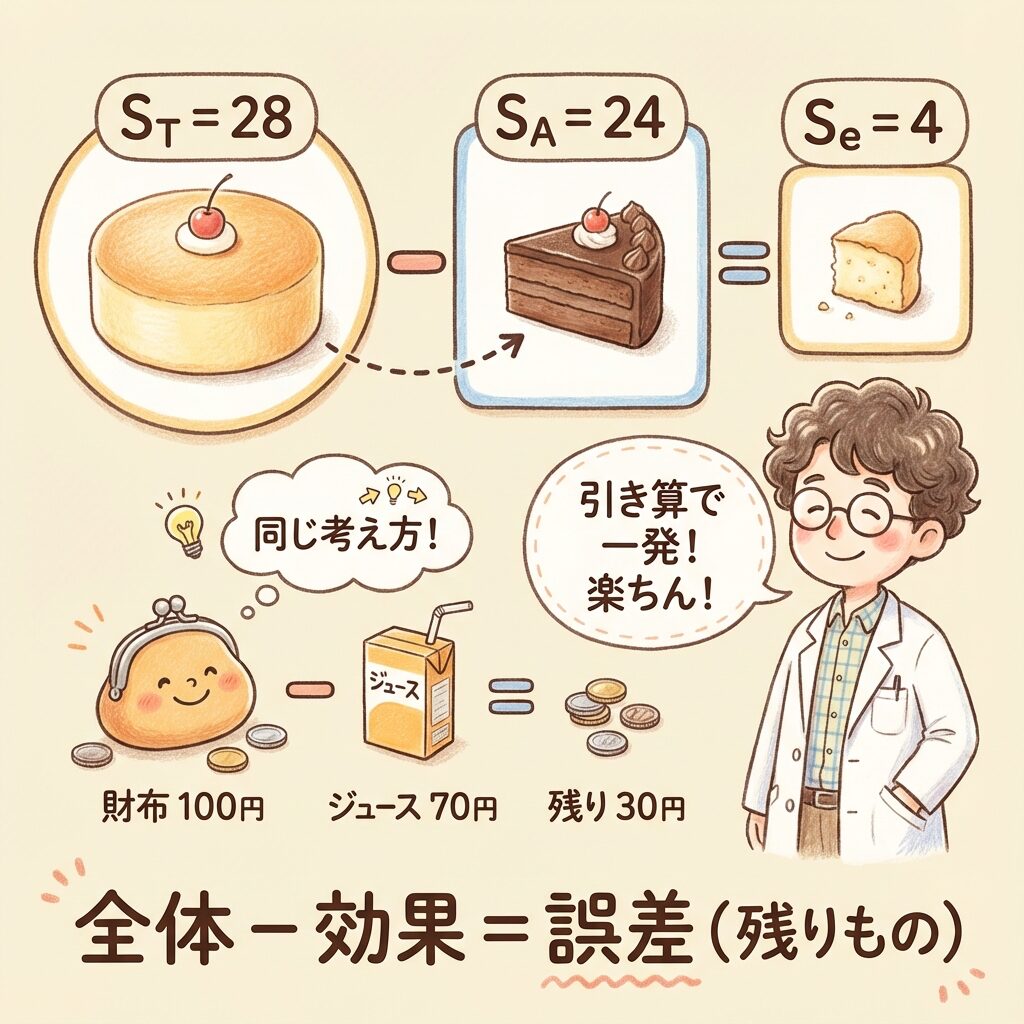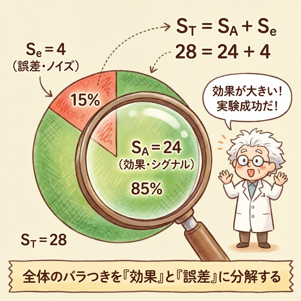 今日は、この塊(ST)を、手術用メスのように鋭い計算式を使って、「効果(SA)」と「誤差(Se)」の2つにきれいに切り分けます。