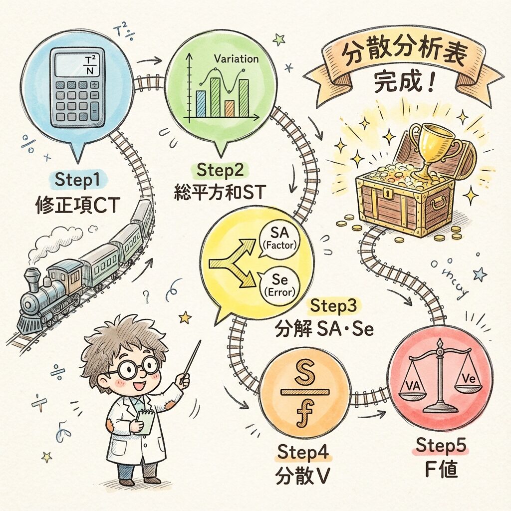 一元配置実験の計算は、「修正項 → 平方和 → 分散 → F値」という流れで進みます。