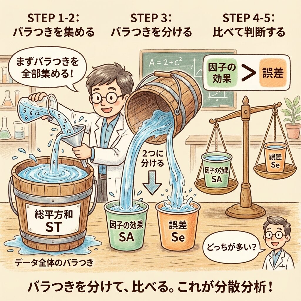 ひとことで言うと:バラつきを「因子の効果」と「偶然の誤差」に分けます。