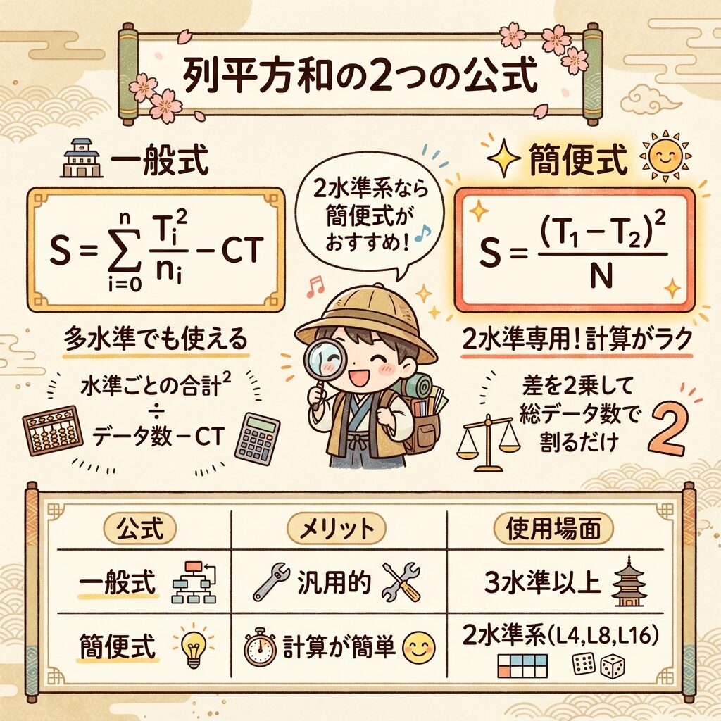 列平方和を求める公式は2つあります。どちらを使っても同じ答えになりますが、2水準系では「簡便式」を使うと計算がラクになります。