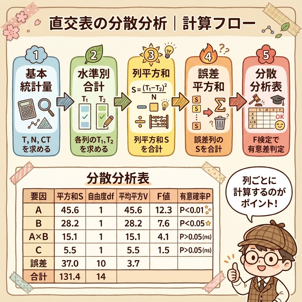 この関係を使うと、計算の検算ができます。総平方和を直接計算した値と、列平方和の合計が一致すれば、計算が正しいことが確認できます。