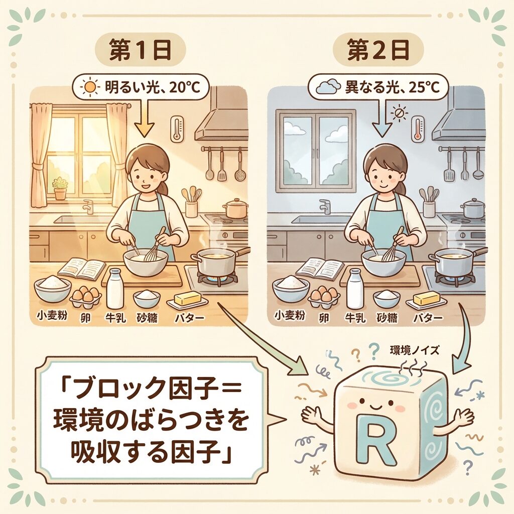 - だから、その影響を分離して取り除くためにブロック因子として扱う