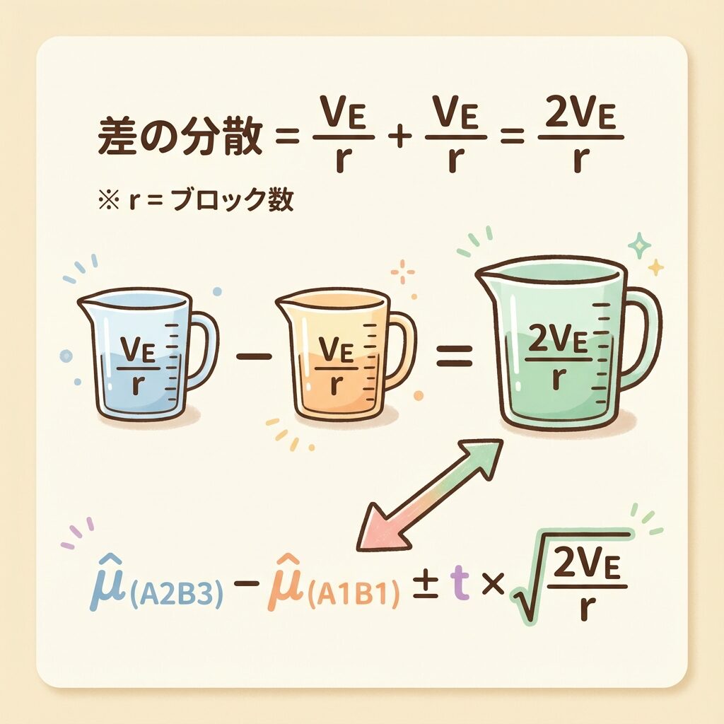 | 差の分散 | 2VE / r (r = ブロック数) |