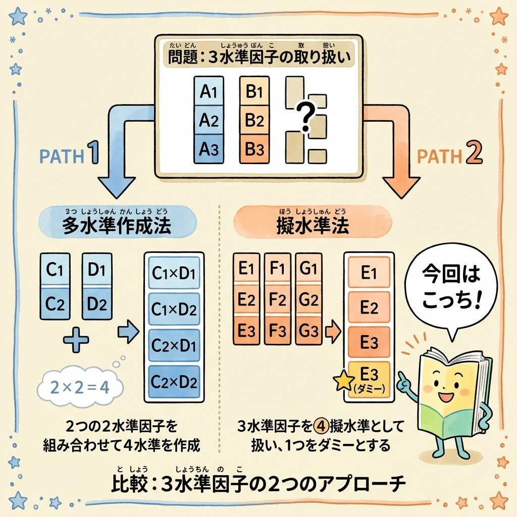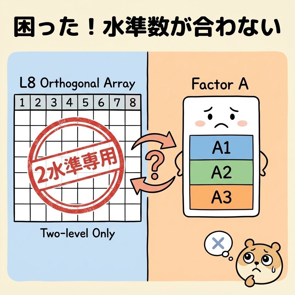 【完全図解】擬水準法とは?|2水準系直交表に3水準因子を入れる「裏技」をL8で徹底解説