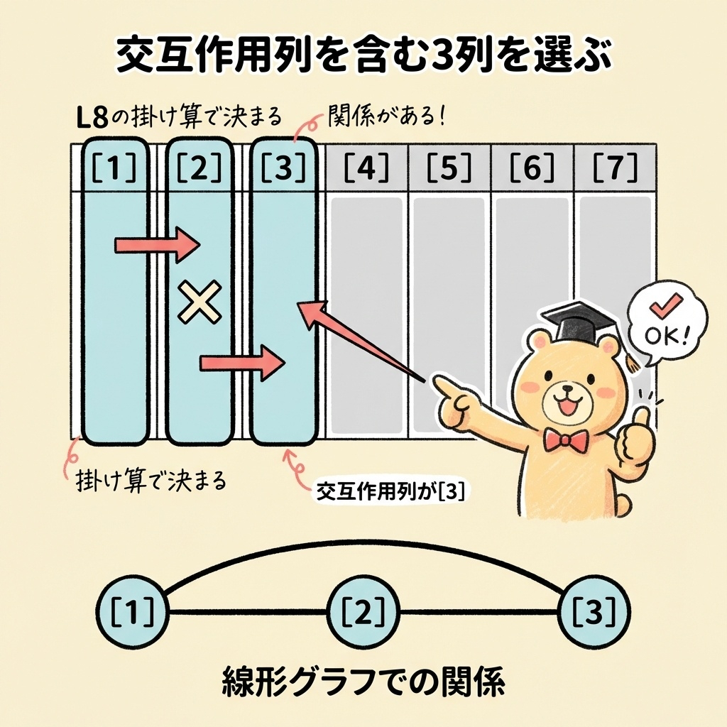 たとえば、[1]列と[2]列の交互作用は[3]列に現れます