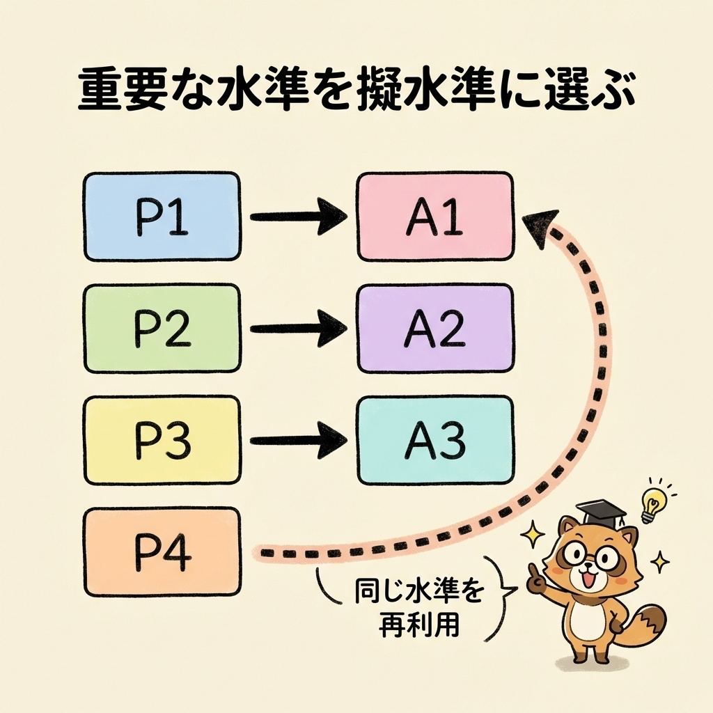いよいよ、形式的な4水準(P₁~P₄)と実際の3水準(A₁、A₂、A₃)を対応させます。