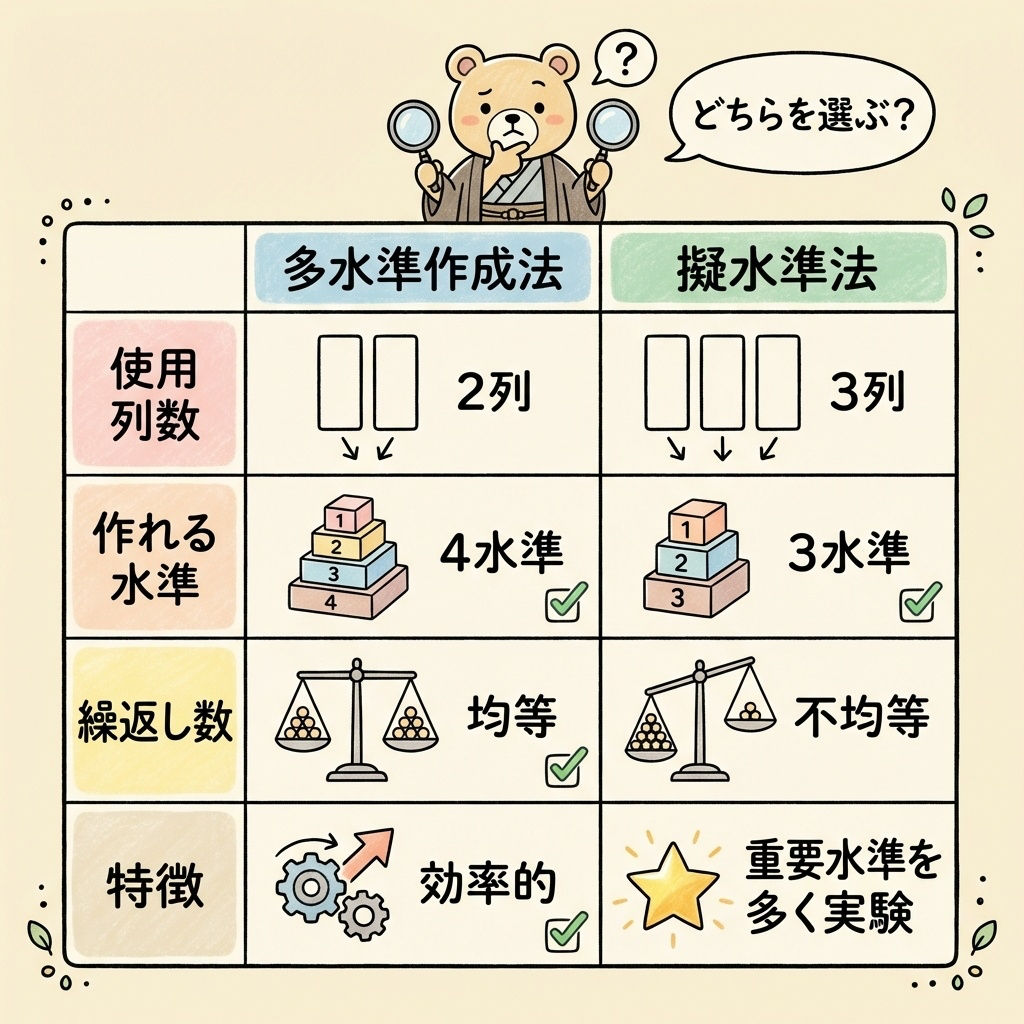 擬水準法では、どの水準を擬水準に選ぶかが重要な設計判断になります。