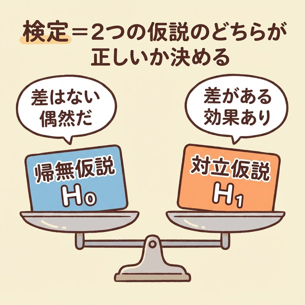 無罪(最初の仮定)帰無仮説(H₀)「差はない(偶然だ)」