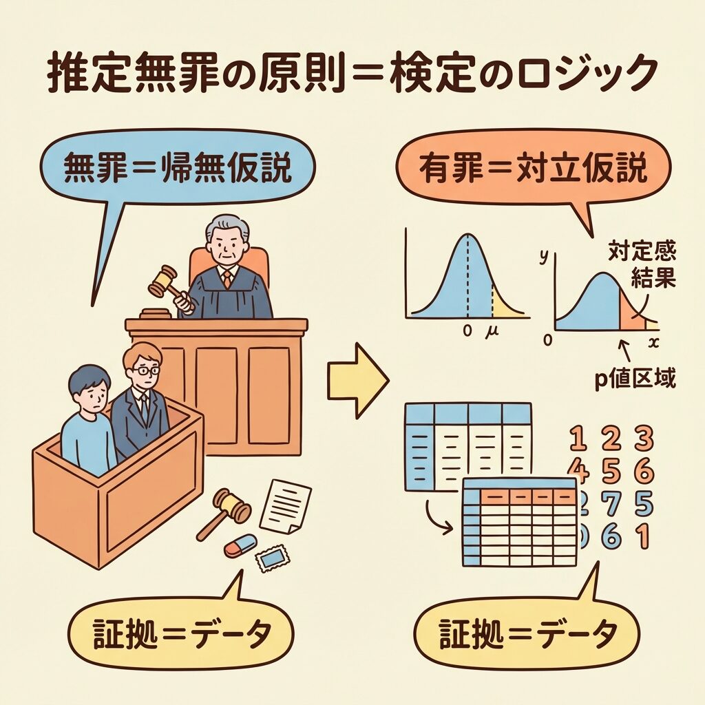 今日は、この「帰無仮説」のロジックを、裁判の「推定無罪」に例えてスッキリ理解しましょう。