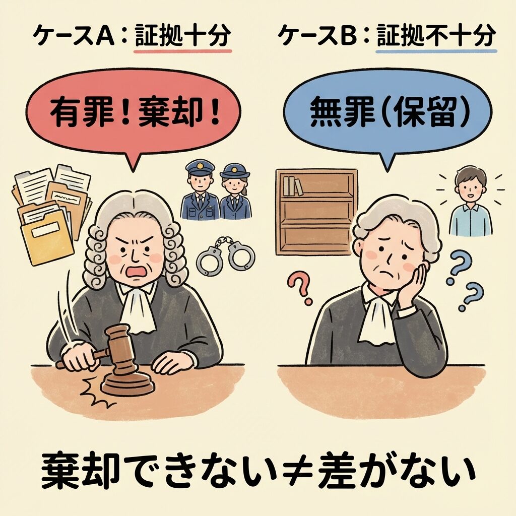 =「無罪を覆すほどの証拠が出なかった。だから今回は無罪(差があるとは言えない)としておこう」