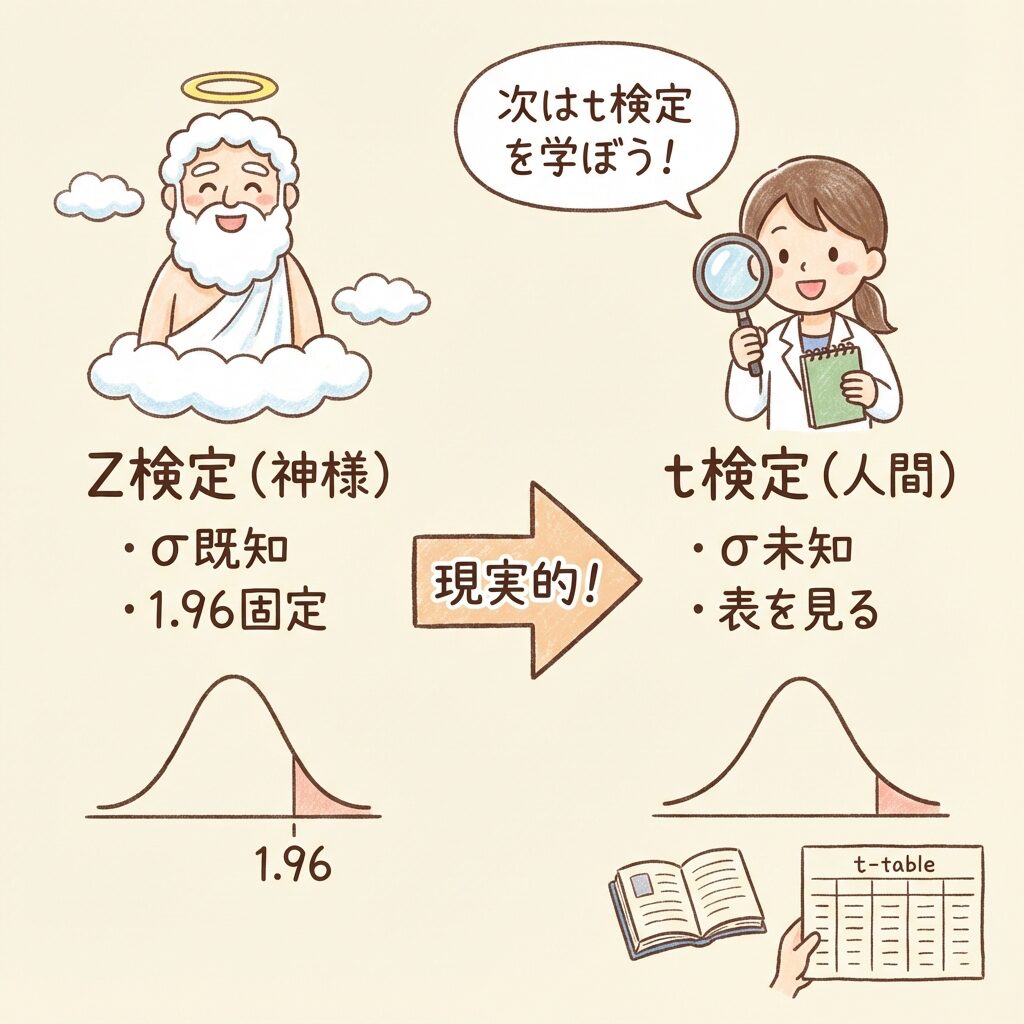 🤔 実際に使うのはt検定って聞いたけど、なんでZ検定を学ぶの?