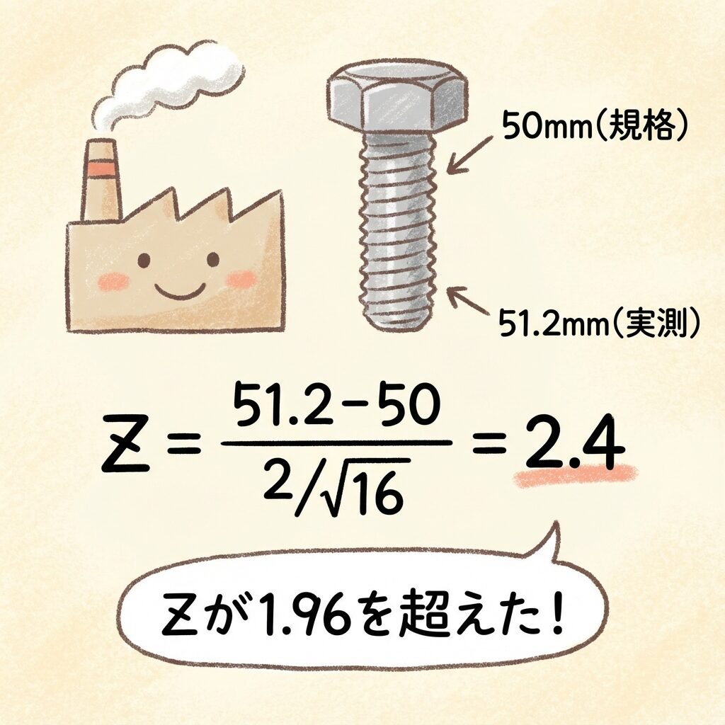 このZ値が「±1.96」を超えたら、「5%しか起こらないことが起きた!」と判断し、帰無仮説を棄却します。