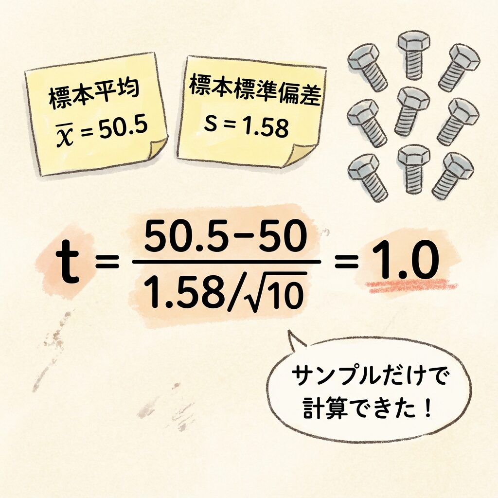 平均50.5mmは規格50mmより少し大きいですが、統計的には「誤差の範囲内」と判断されました。