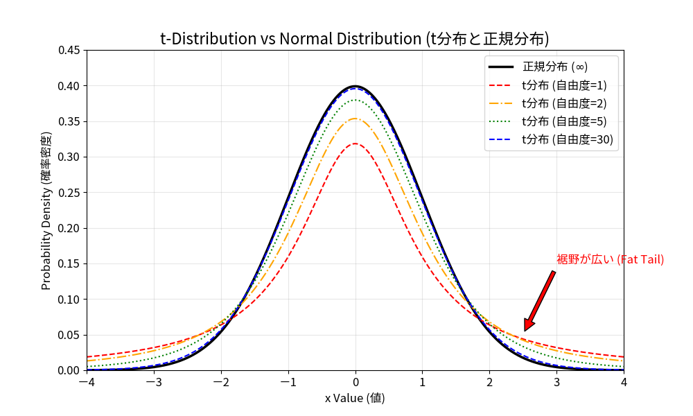つまり、t分布には「データの不確実さ(迷い)」が含まれているため、正規分布のように「ここだ!」と一点に集中できず、「もしかしたら、もっと極端な値が出るかも…」と左右に広がってしまうのです。
