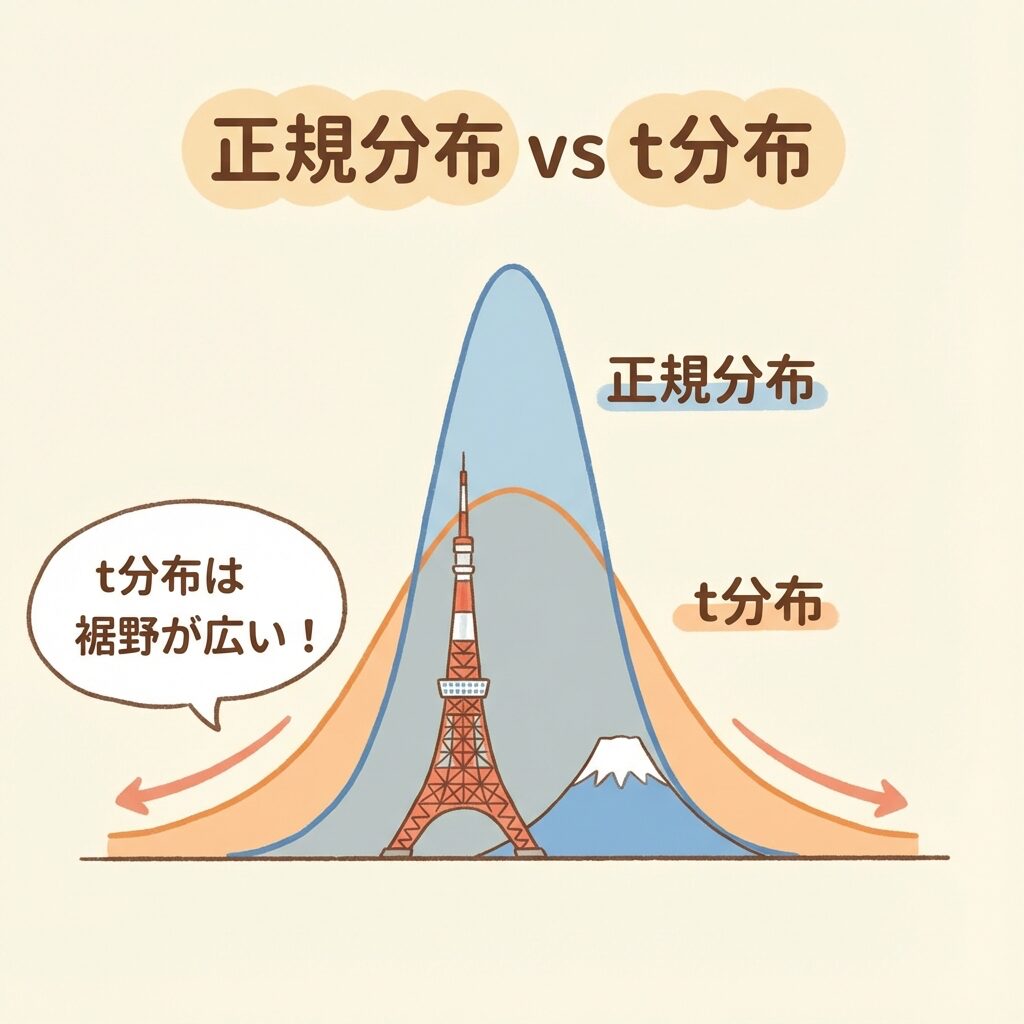 • t分布は正規分布より裾野が広い(極端な値が出やすい形)