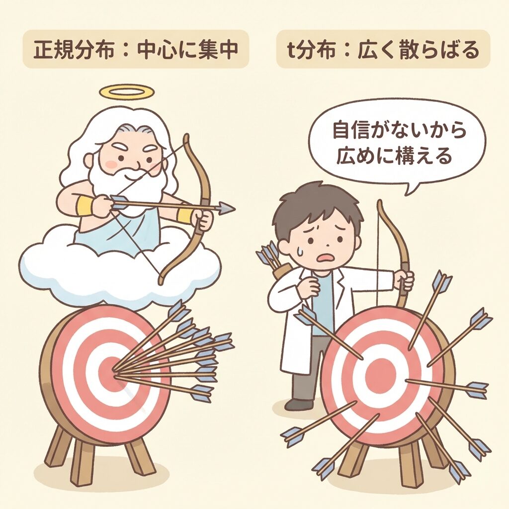 t分布と正規分布の違いを、弓矢の的当てでたとえてみましょう。