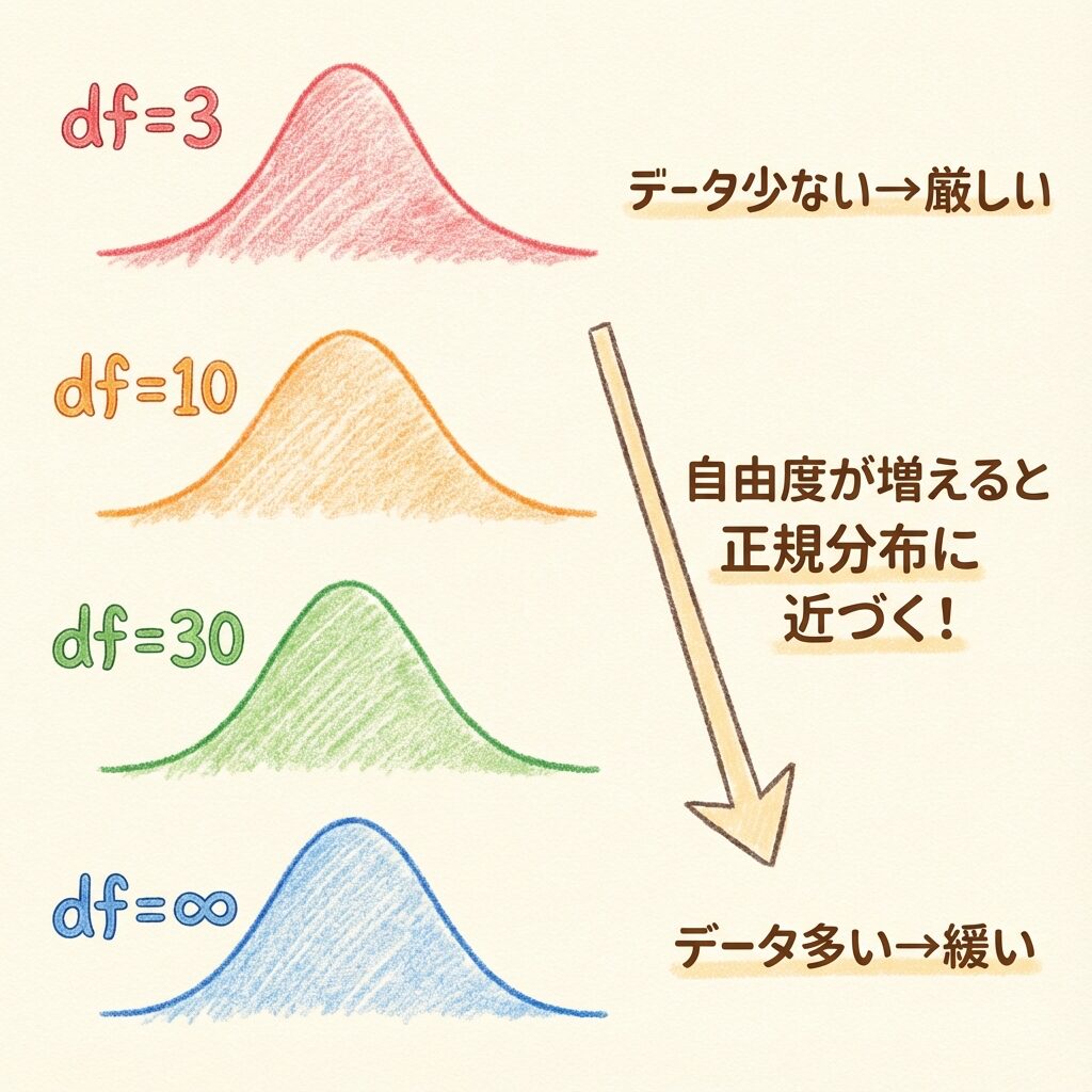 【図解】t分布と自由度|データが少ないと判定基準が厳しくなる理由