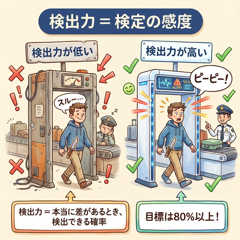| 検出力とは | 本当に差があるとき、正しく「差がある」と判断できる確率(1−β) |