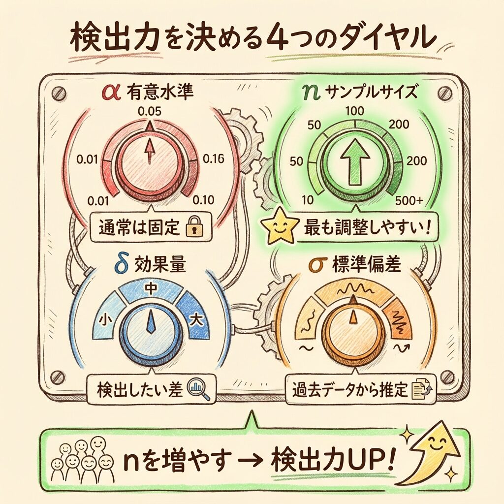 | 検出力を決める要素 | α(有意水準)、n(サンプルサイズ)、δ(効果量)、σ(標準偏差) |