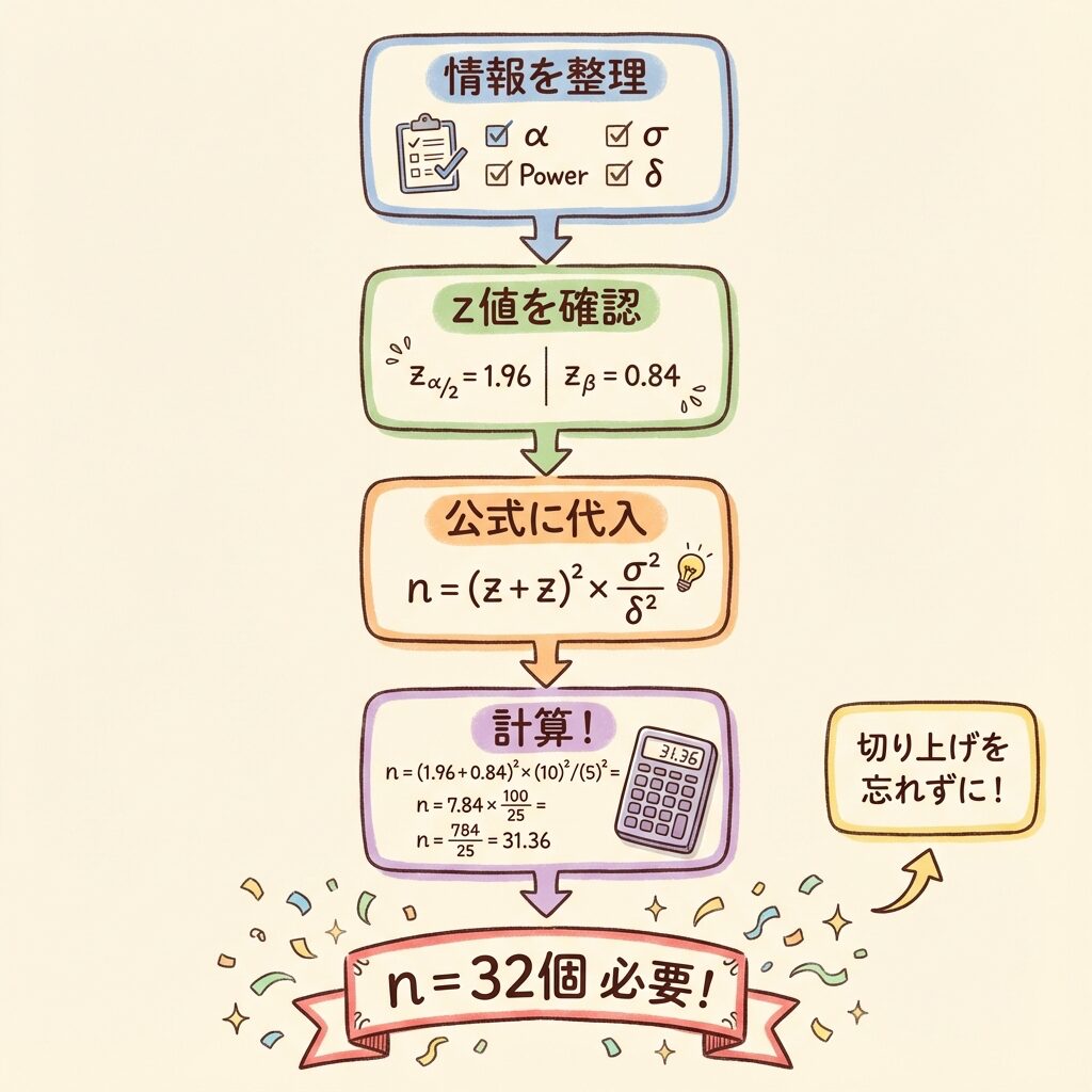 | 計算のタイミング | 実験の「前」に行う(後からでは遅い!) |