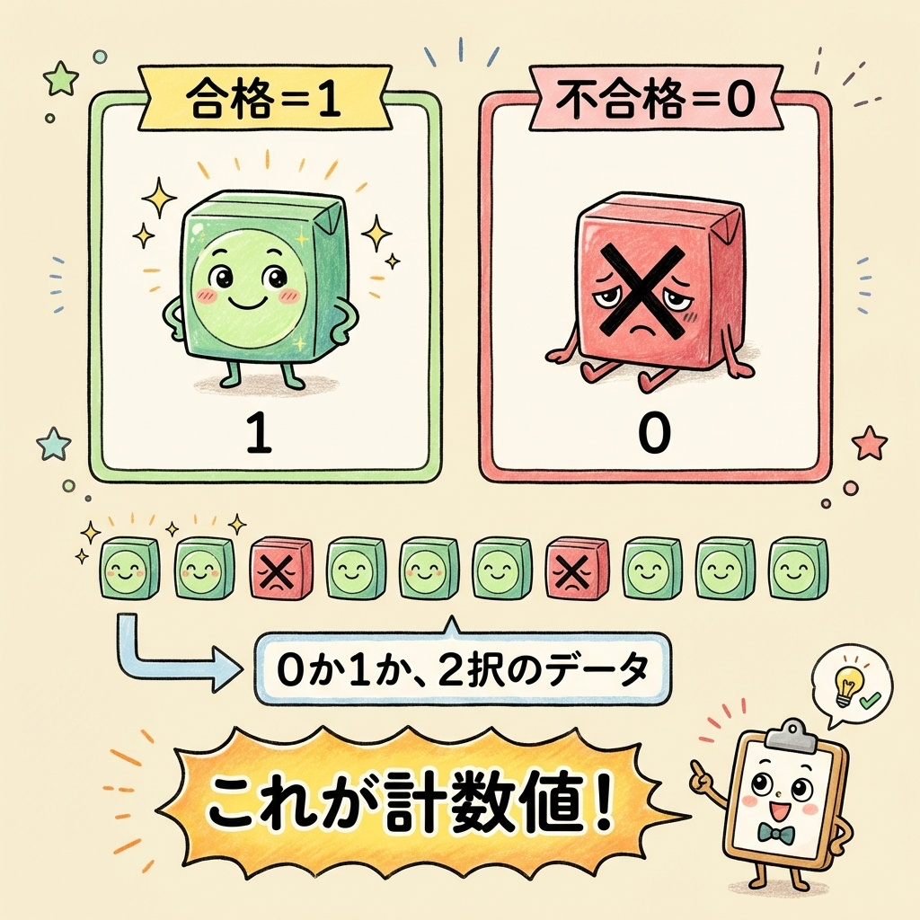 計量値は「12.5cm」「68.3kg」のように小数点以下まで測れますが、計数値は「合格 or 不合格」「良品 or 不良品」のように0か1かの2択です。この「2択のデータ」を集計したものが「比率」なのです。