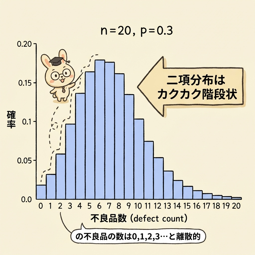 これらはすべて二項分布に従います。二項分布の特徴は、「階段状のカクカクした形」をしていることです。なぜなら、不良品の数は「0個、1個、2個...」と整数でしか取らないからです。