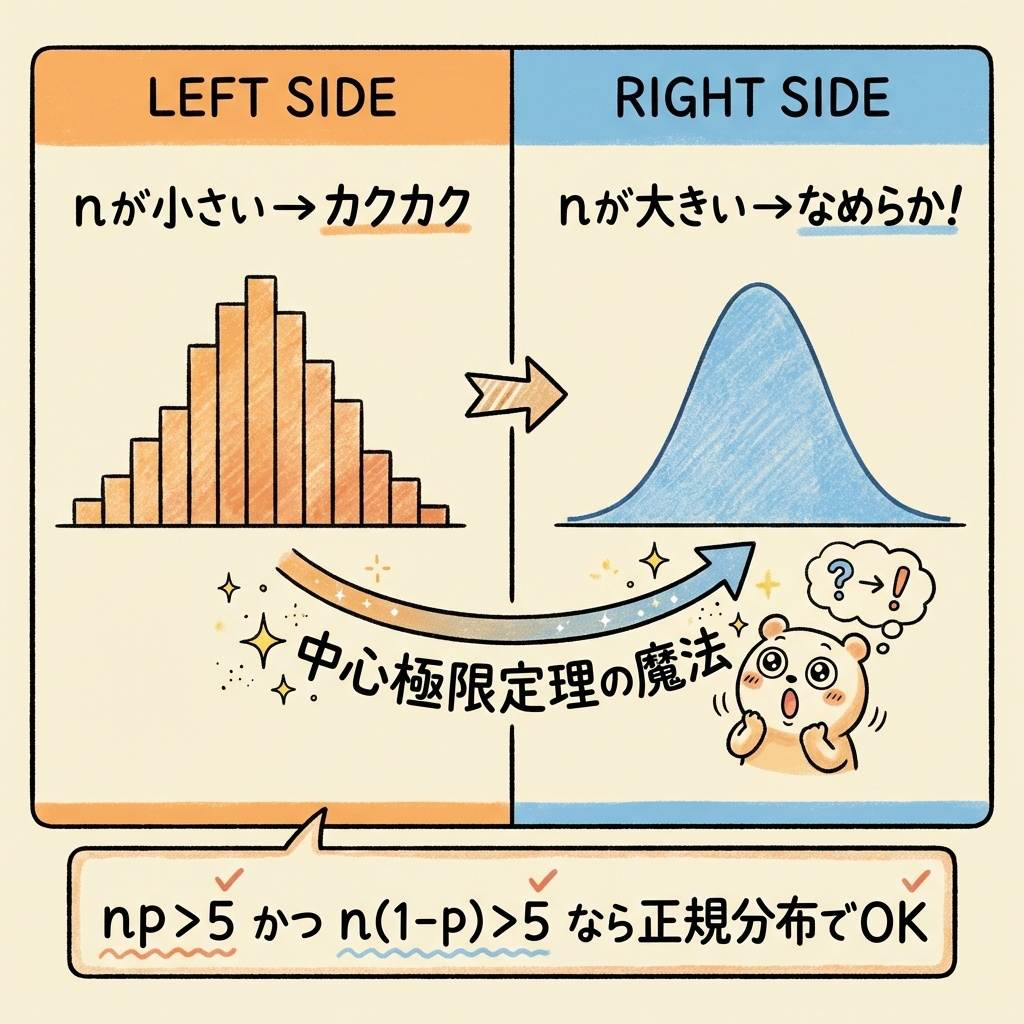 ここで「中心極限定理」の魔法が登場します。データ数 n が十分に大きいと、二項分布の階段がどんどん滑らかになり、正規分布とほぼ同じ形になるのです。
