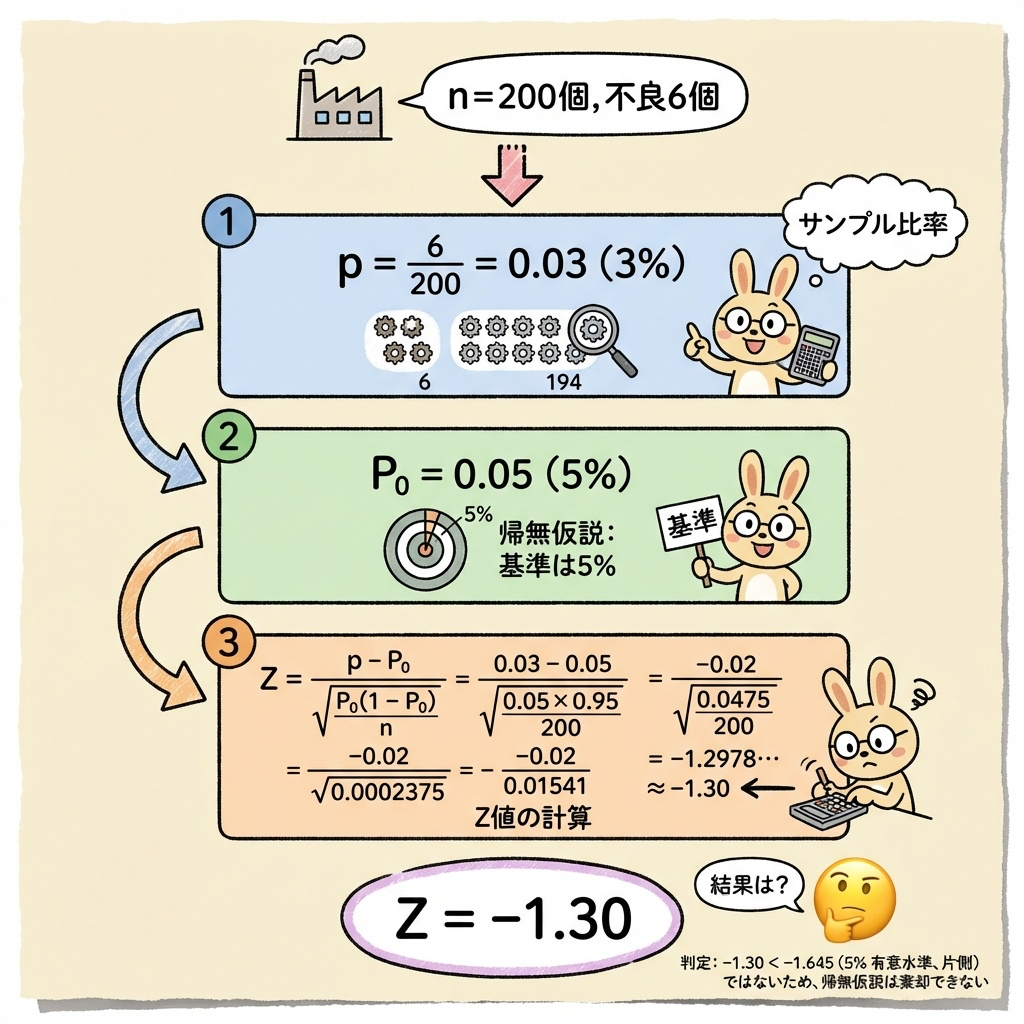 【完全図解】母比率の検定(Z検定)とは?|「不良率5%→3%は改善?」を二項分布から導く検定統計量の意味