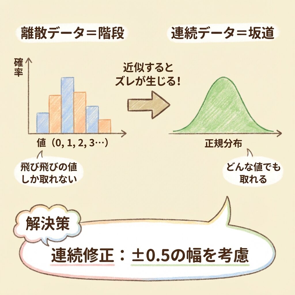 連続修正とは、離散データを連続分布で近似するときの「ズレ」を補正するため、±0.5の幅を考慮する手法です。