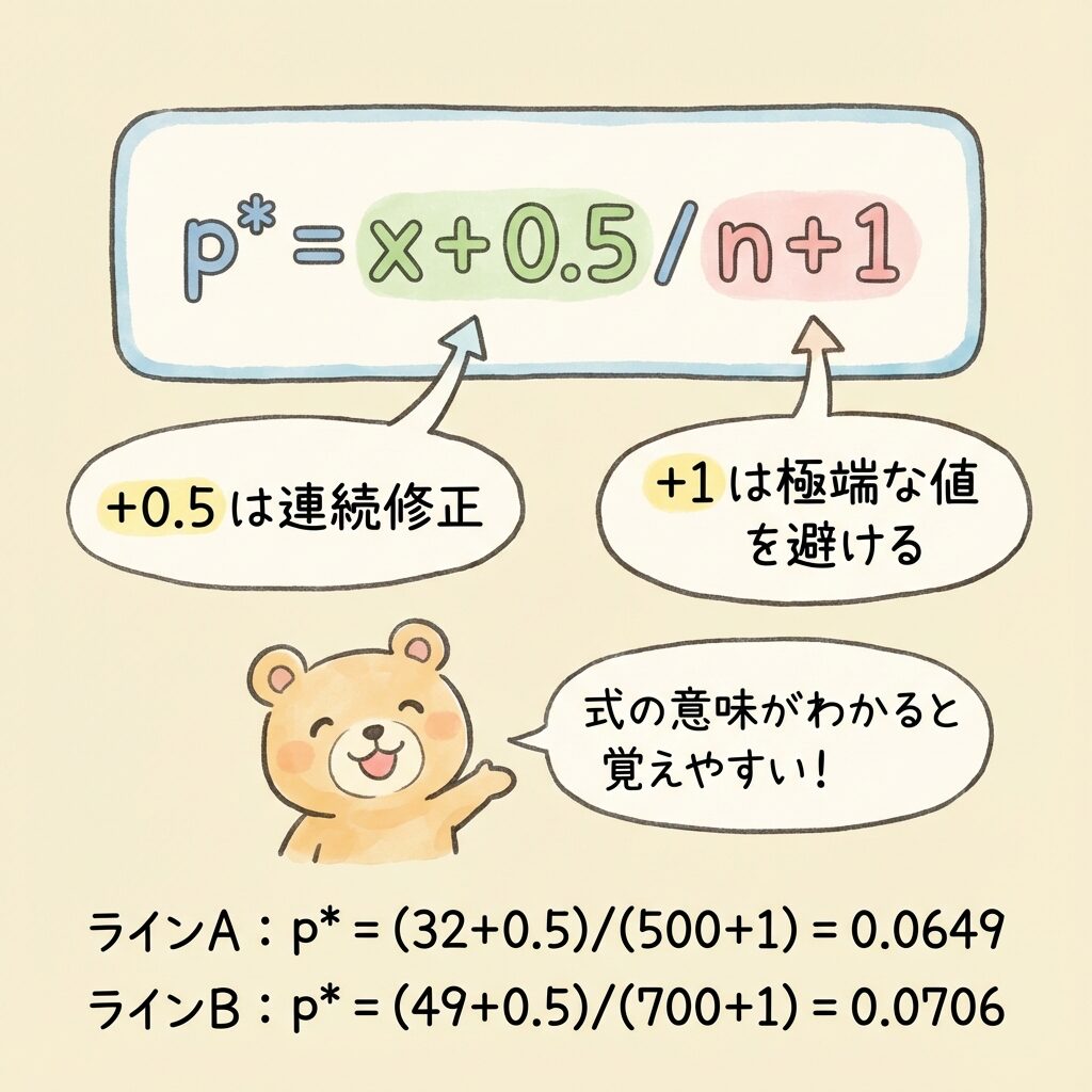 普通の不適合品率は p = x/n なのに、なぜ分子に+0.5、分母に+1を足すのか?
