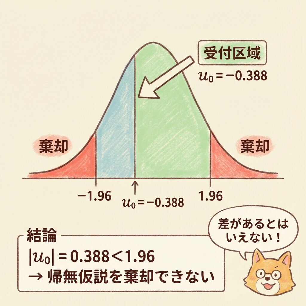 |u₀| = 0.388 < 1.96 なので、帰無仮説を棄却できません。