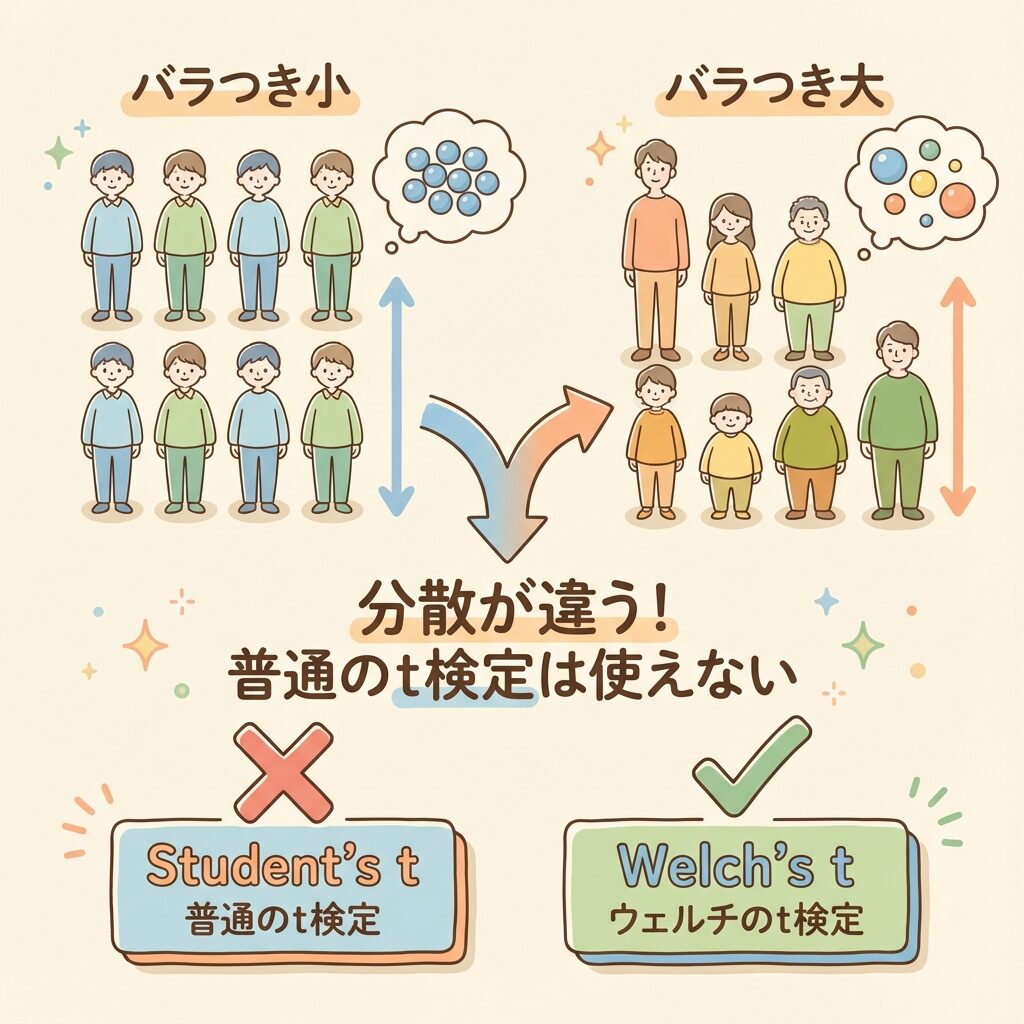 普通のt検定(Studentのt検定)は、「2つのグループのバラつき(分散)が同じ」という前提で使うものなんです。もし分散が違う場合、普通のt検定を使うと、間違った結論を出してしまう危険があります。