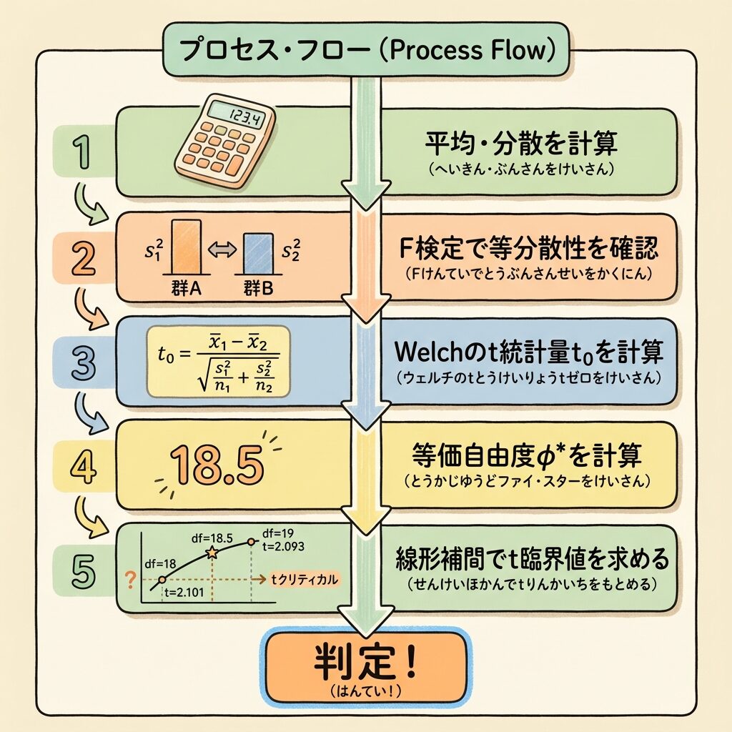 | 4 | Welchのt₀を計算 | t₀ = 1.069 |