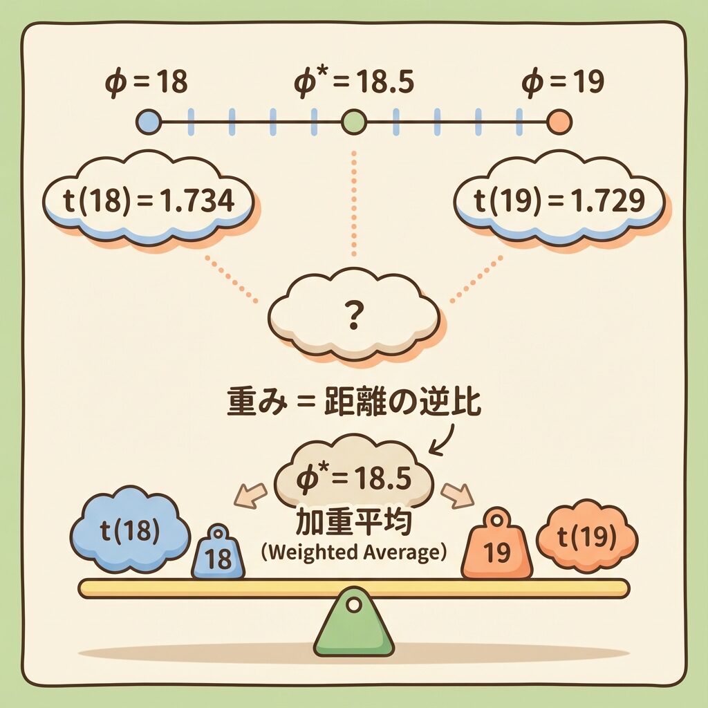 そこで、φ = 13 と φ = 14 のt値から、φ* = 13.91 のt値を推定するのが線形補間法です。