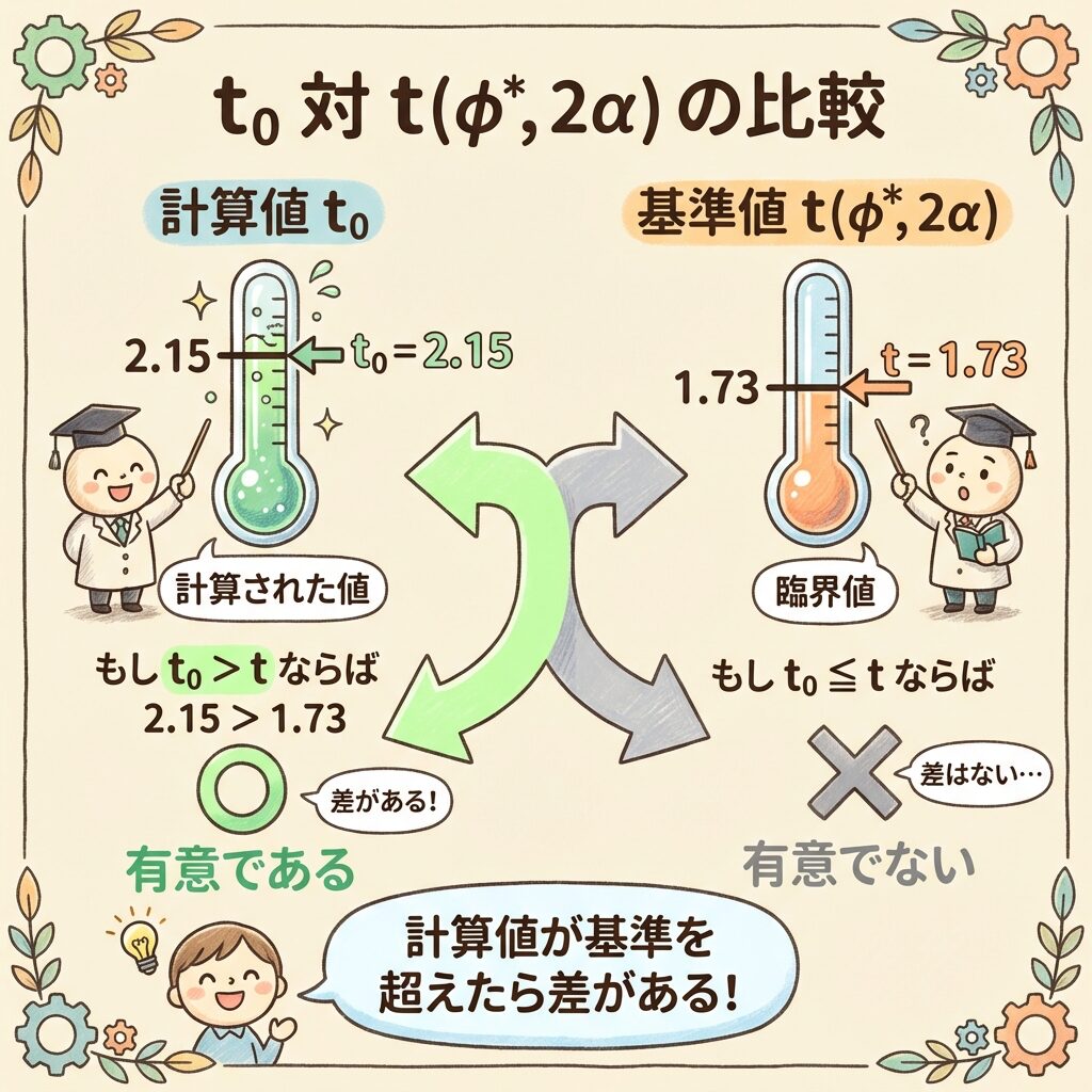 - t₀ > t(φ*, 2α) → 有意である(帰無仮説を棄却)