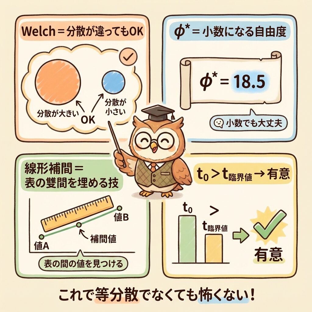 ただし、Welchの検定には1つ厄介な問題があります。それは自由度が小数になること。t分布表には整数の自由度しか載っていないので、「線形補間法」という技を使って、小数の自由度に対応するt値を求める必要があるんです。