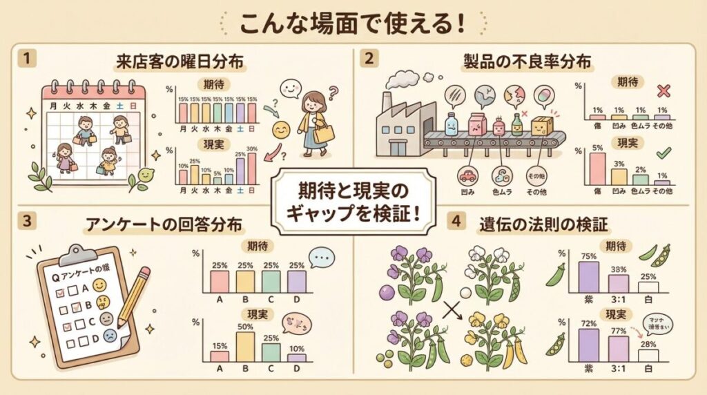 適合度の検定は、「期待される分布」と「実際の分布」を比較したいあらゆる場面で使えます。