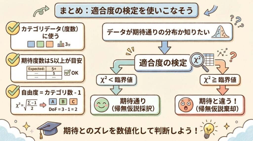 • 独立性の検定との違い:適合度の検定は「1つの変数の分布」を見る検定です。「2つの変数の関連」を見る場合は「独立性の検定」を使います