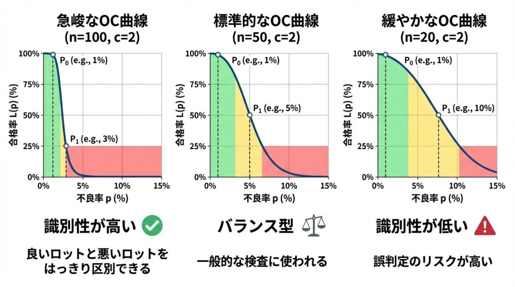 この違いは、検査の識別性(良いロットと悪いロットを区別する能力)を表しています。