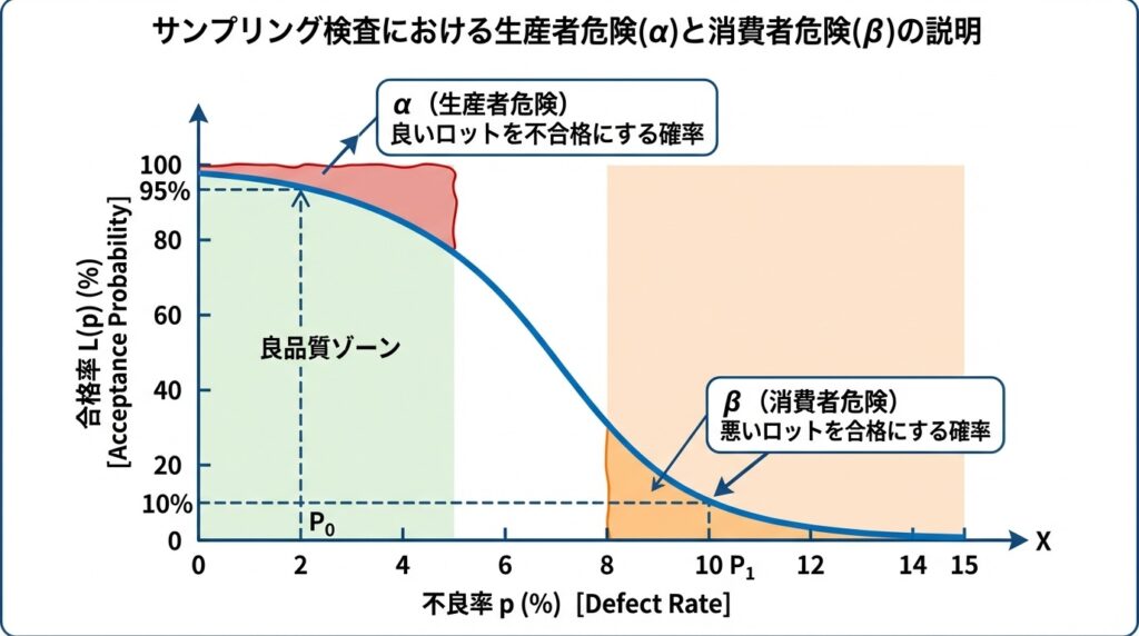 生産者危険(α)は、「良いロットを間違って拒否する」リスクです。