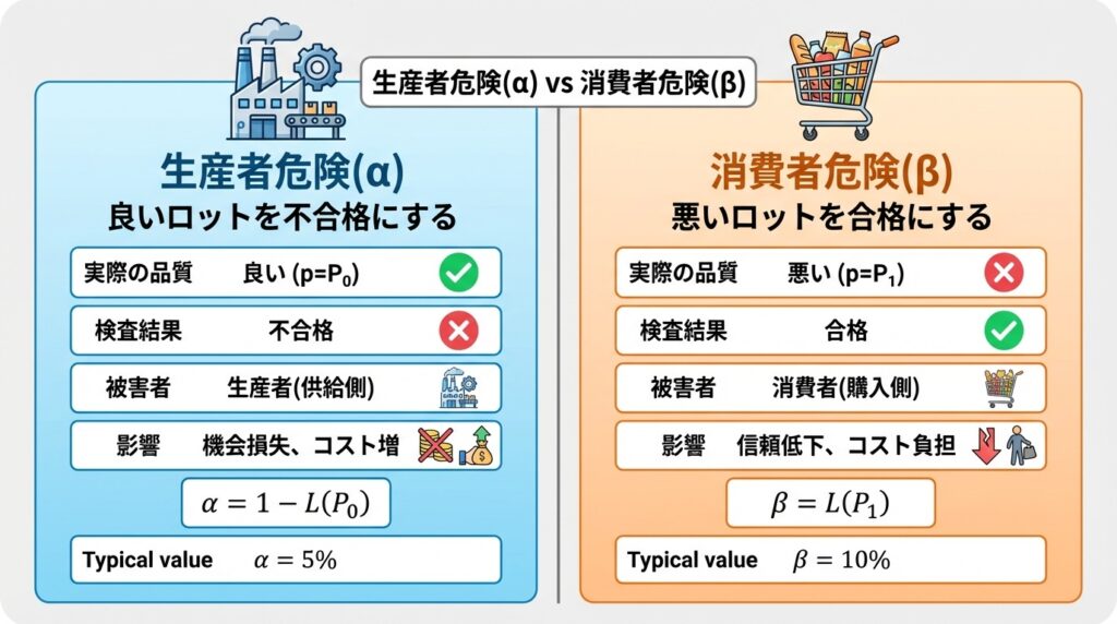 • 生産者危険(α):良いロットを不合格にする間違い → 生産者が損をする