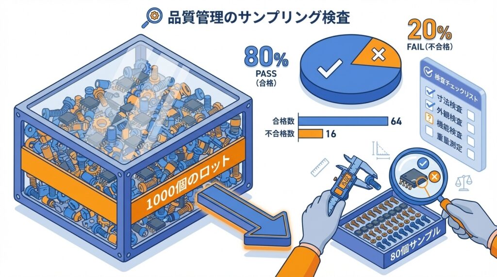 実際の検査では、サンプル数とAc値(合格判定個数)が統計的に計算されています。例えば、ロットサイズ1,000個でAQL 1.0%の場合: