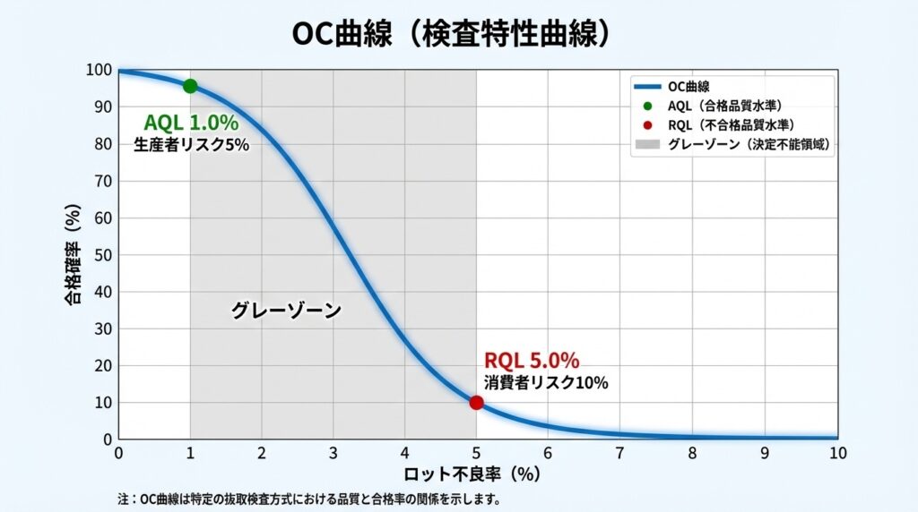 つまり、AQLとRQLの間にグレーゾーンが存在し、この範囲では「合格する時もあれば、不合格の時もある」という状態になります。