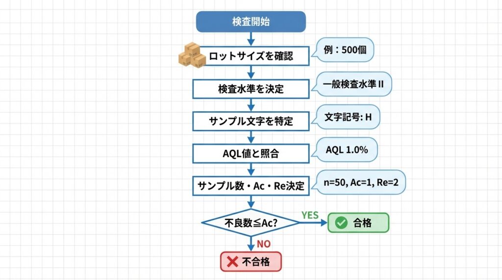 なぜダメか: JIS Z 9015は統計的に設計されています。サンプル数を勝手に変えると、OC曲線(検査特性)が崩れ、AQLの意味が失われます。必ず表に従ってください。